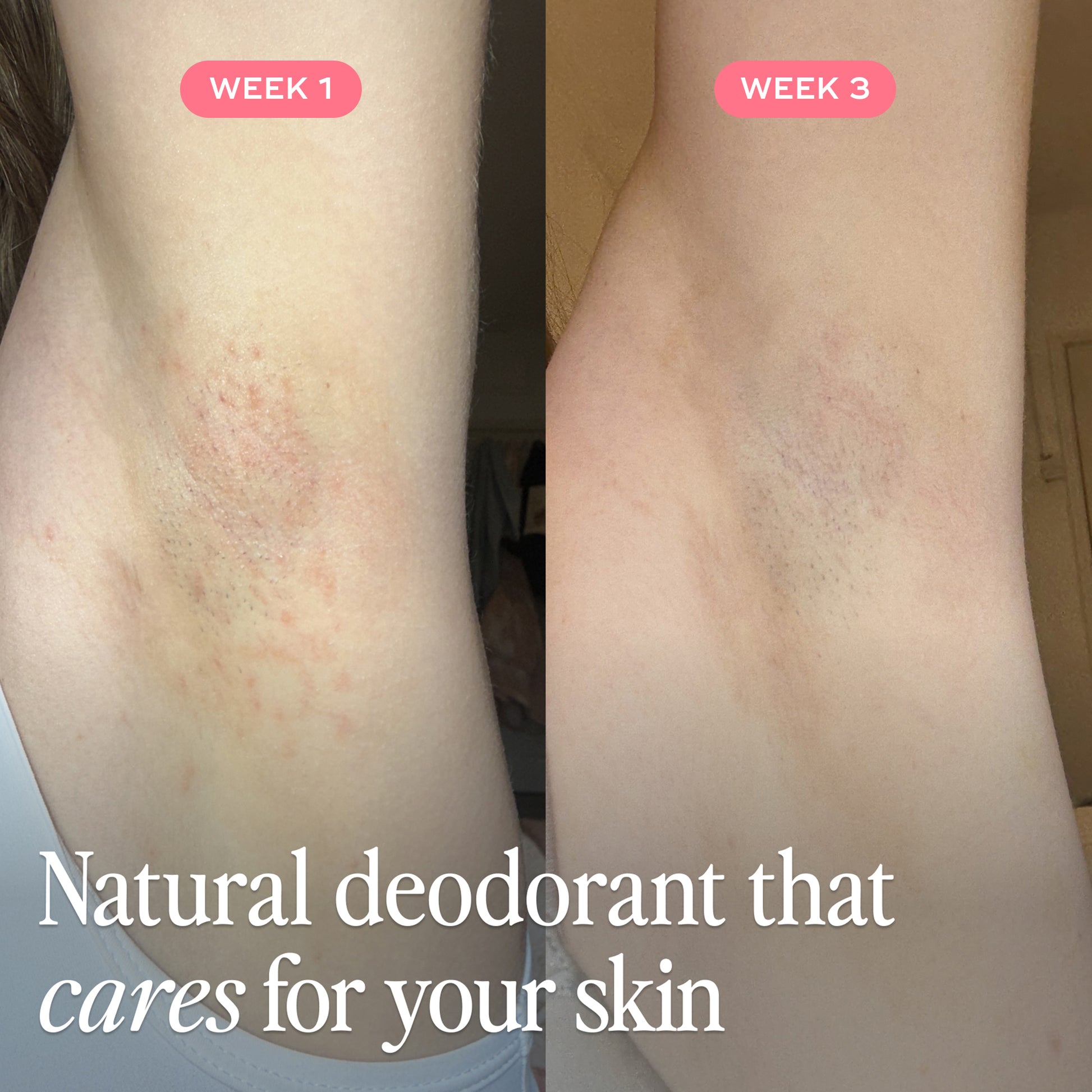 *Clinical user trial on 72 women of all ages, life stages and ethnicities, over three weeks including those who have sensitive skin and those who regularly use natural deodorant.